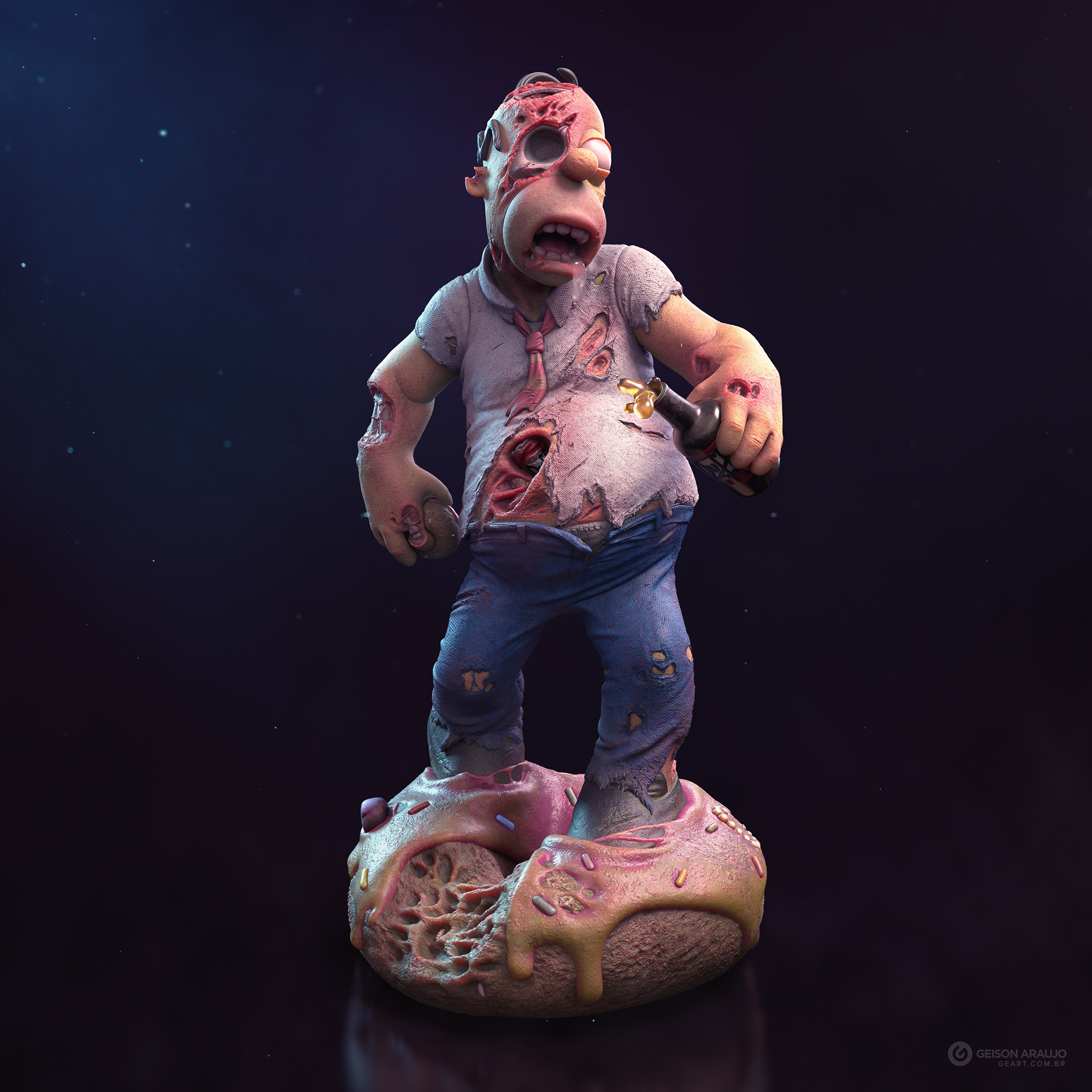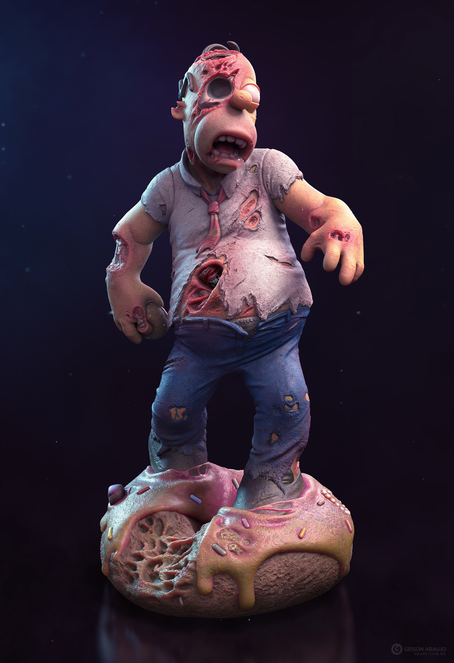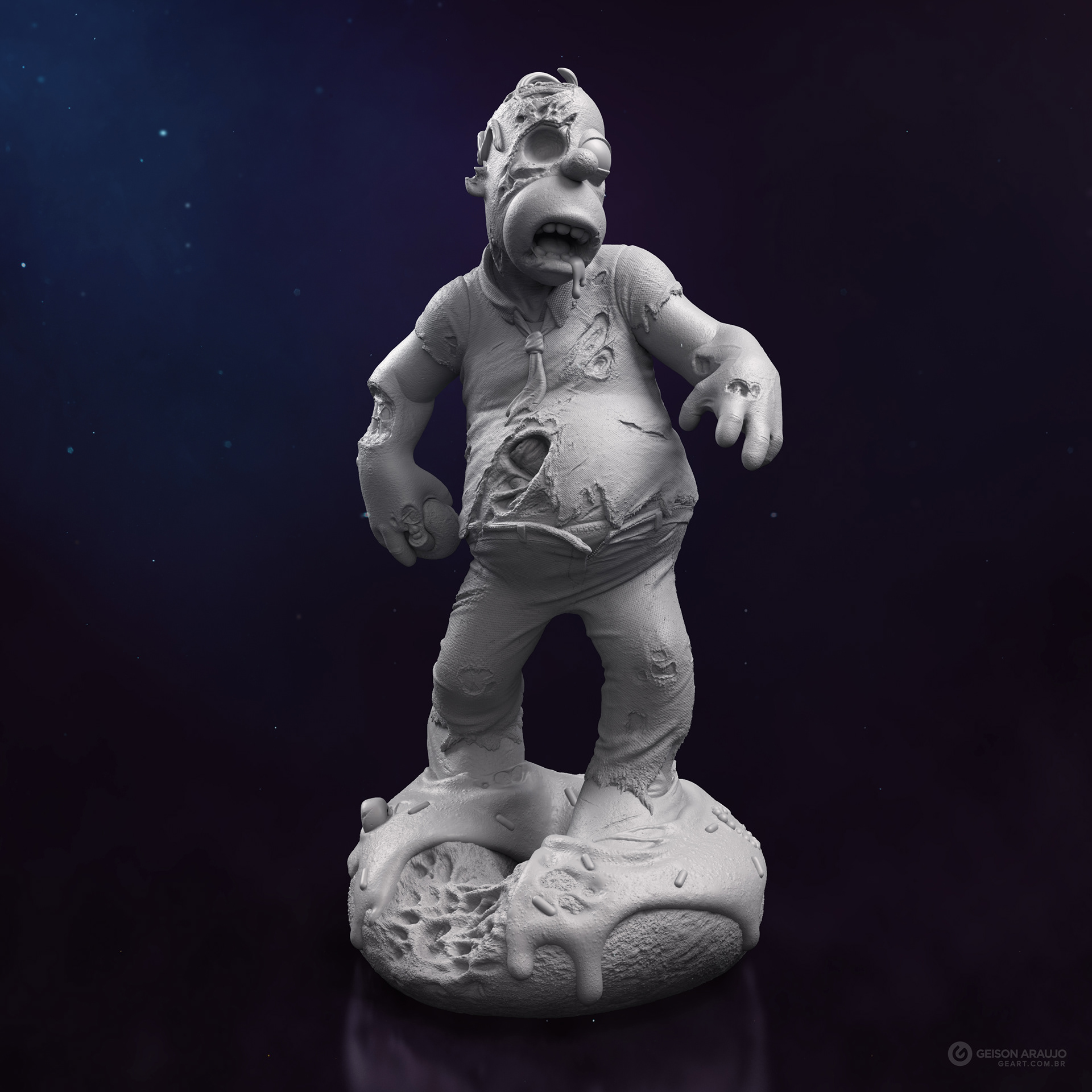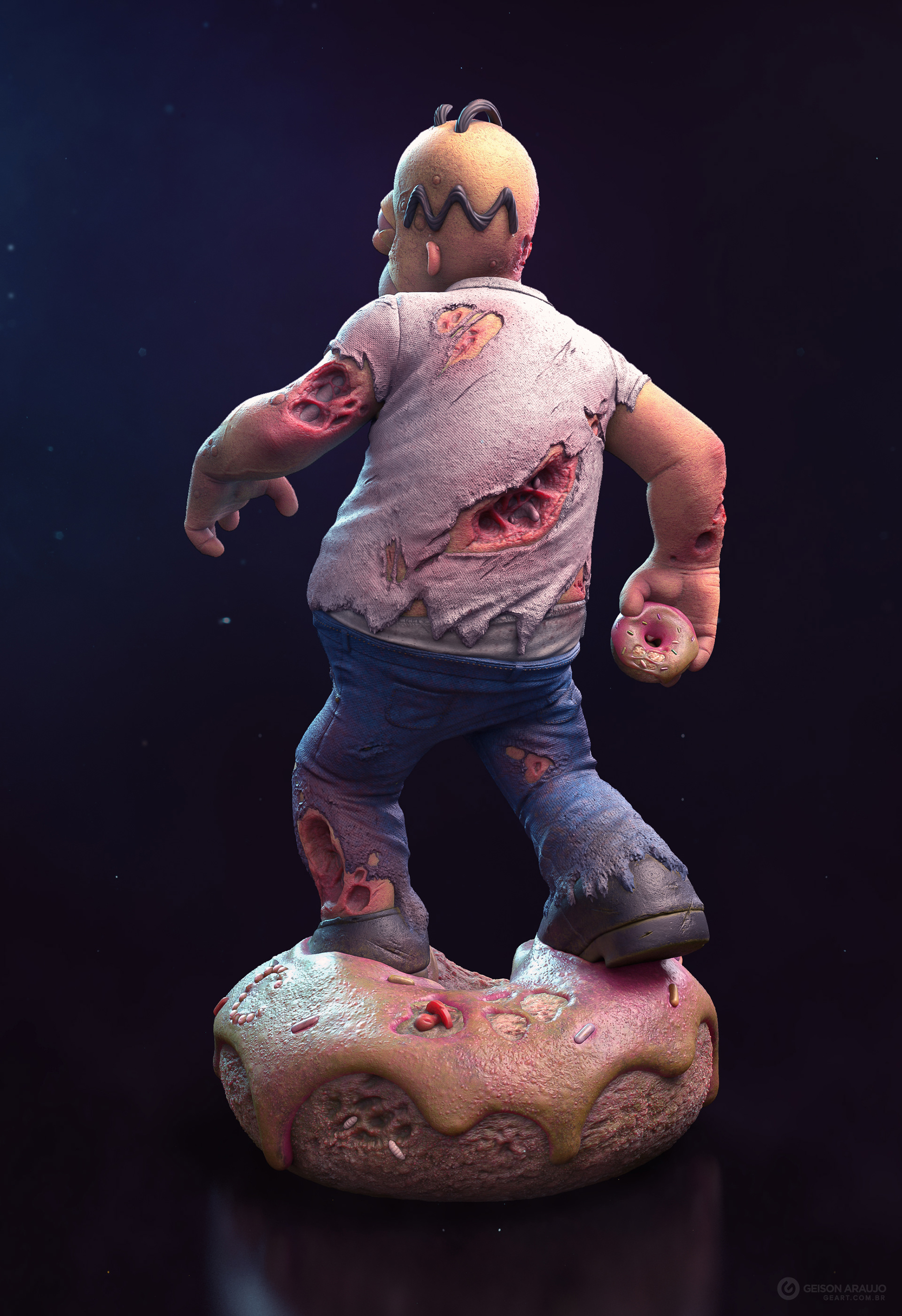 Fan art that I made of Homer, from The Simpsons, like a zombie. This work was made originally like my entry for a collectible contest about famous characters in zombie version, promoted by Alvaro Ribeiro artist, and this is my final version for portfolio.