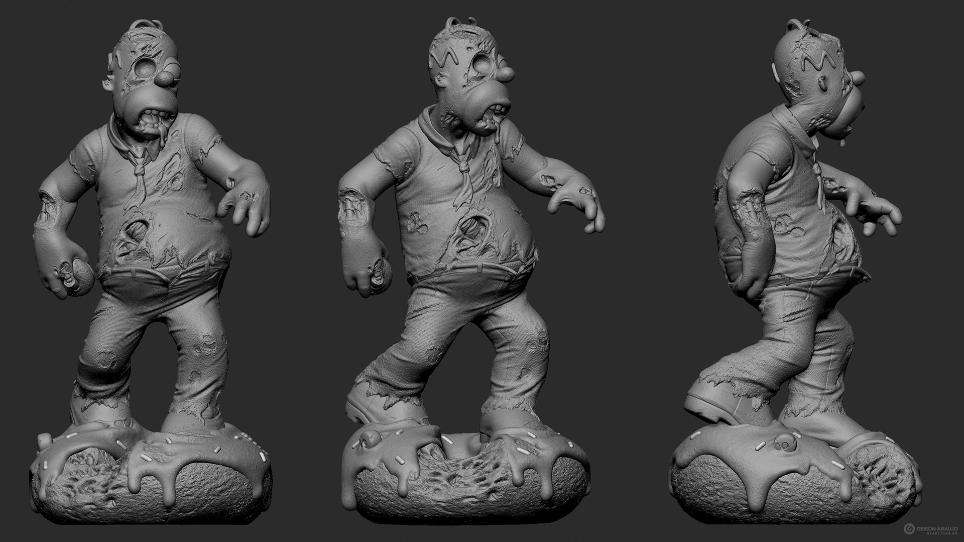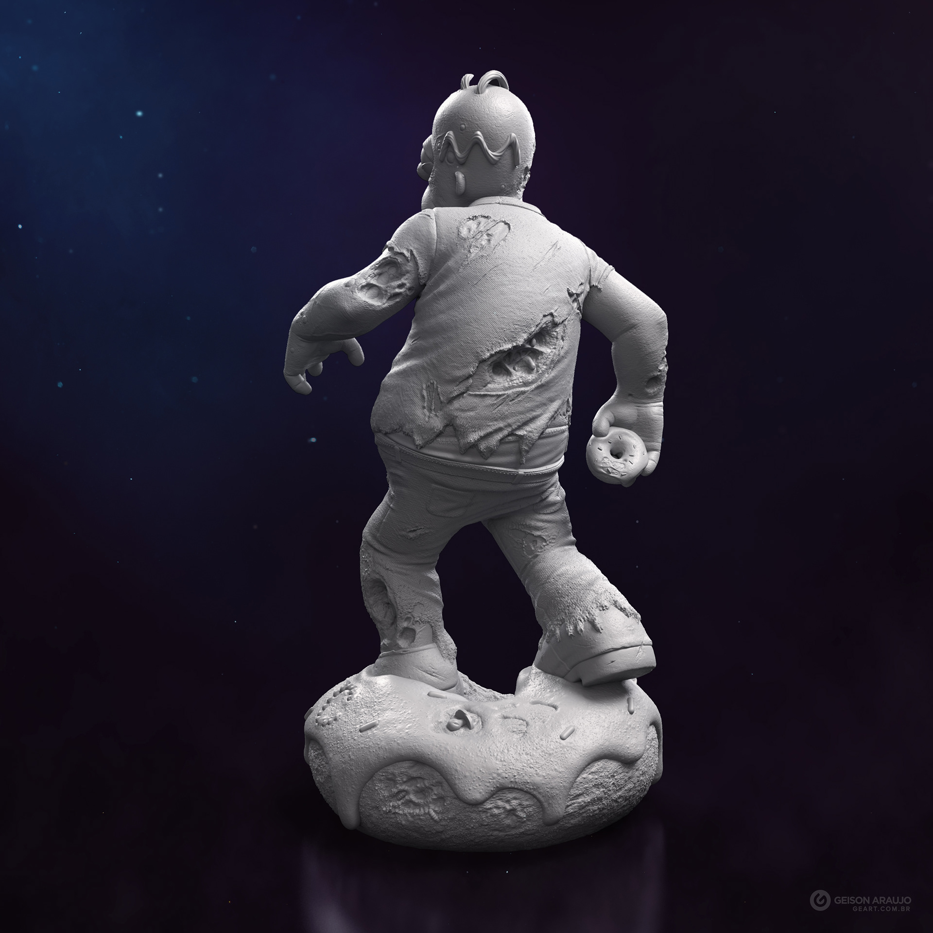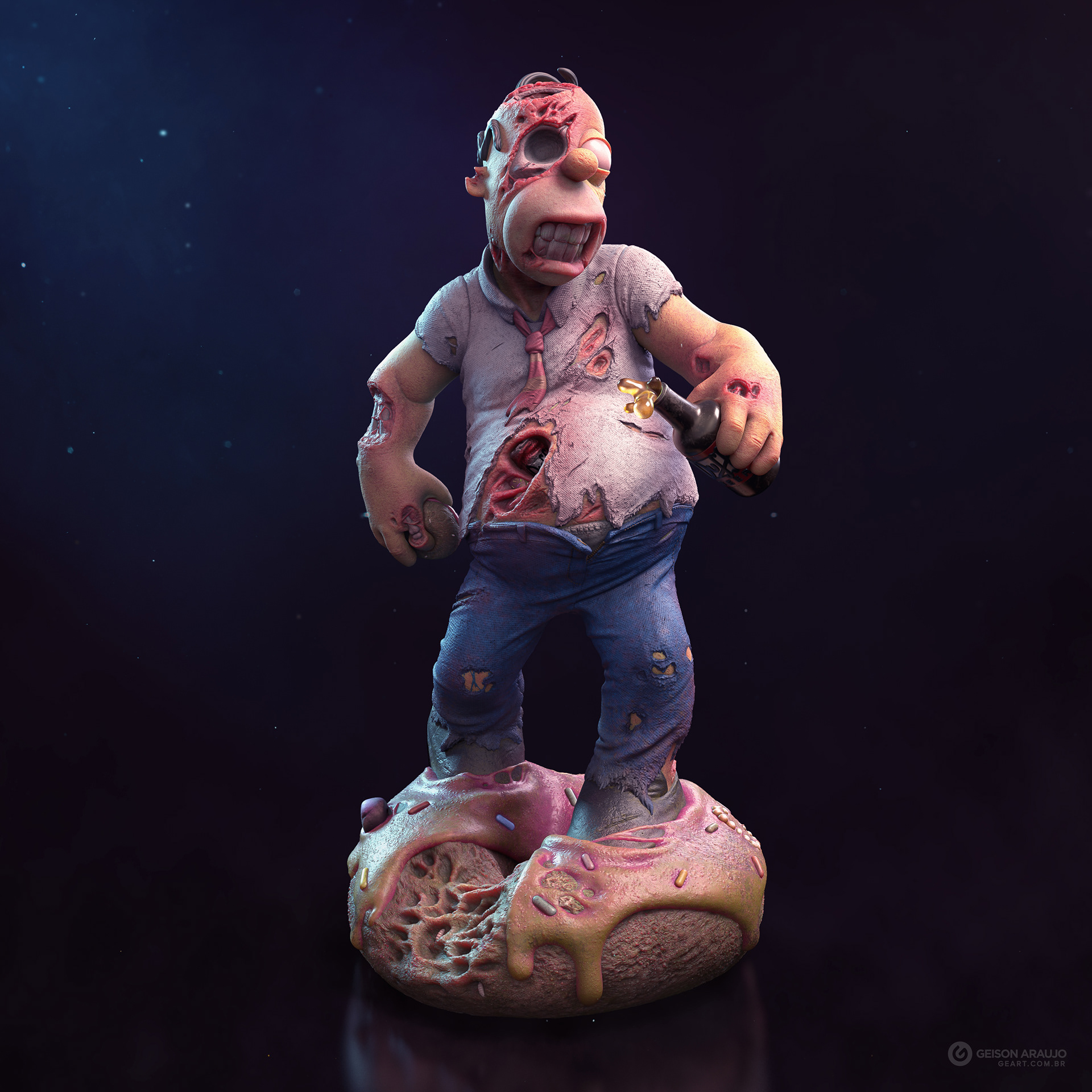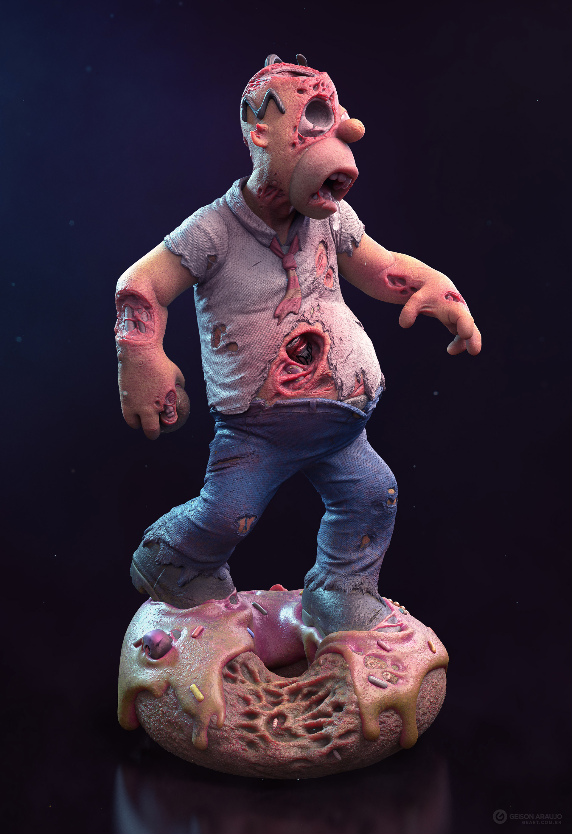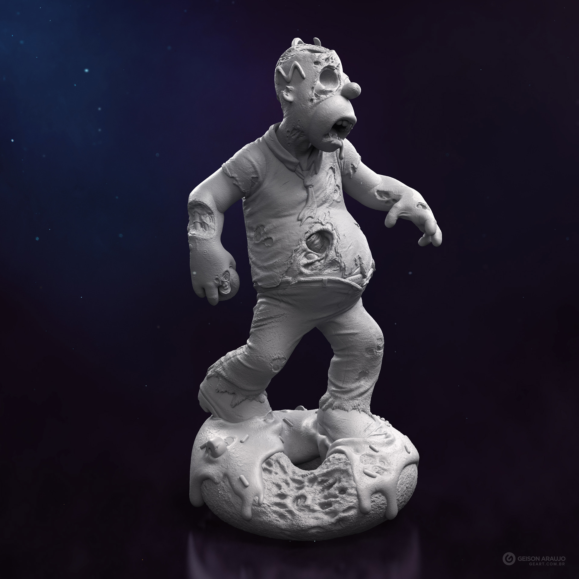 Fan art that I made of Homer, from The Simpsons, like a zombie. This work was made originally like my entry for a collectible contest about famous characters in zombie version, promoted by Alvaro Ribeiro artist, and this is my final version for portfolio.